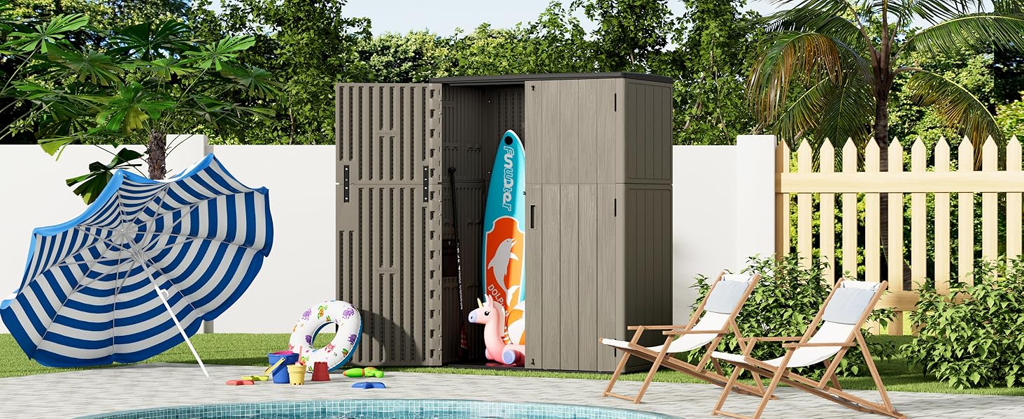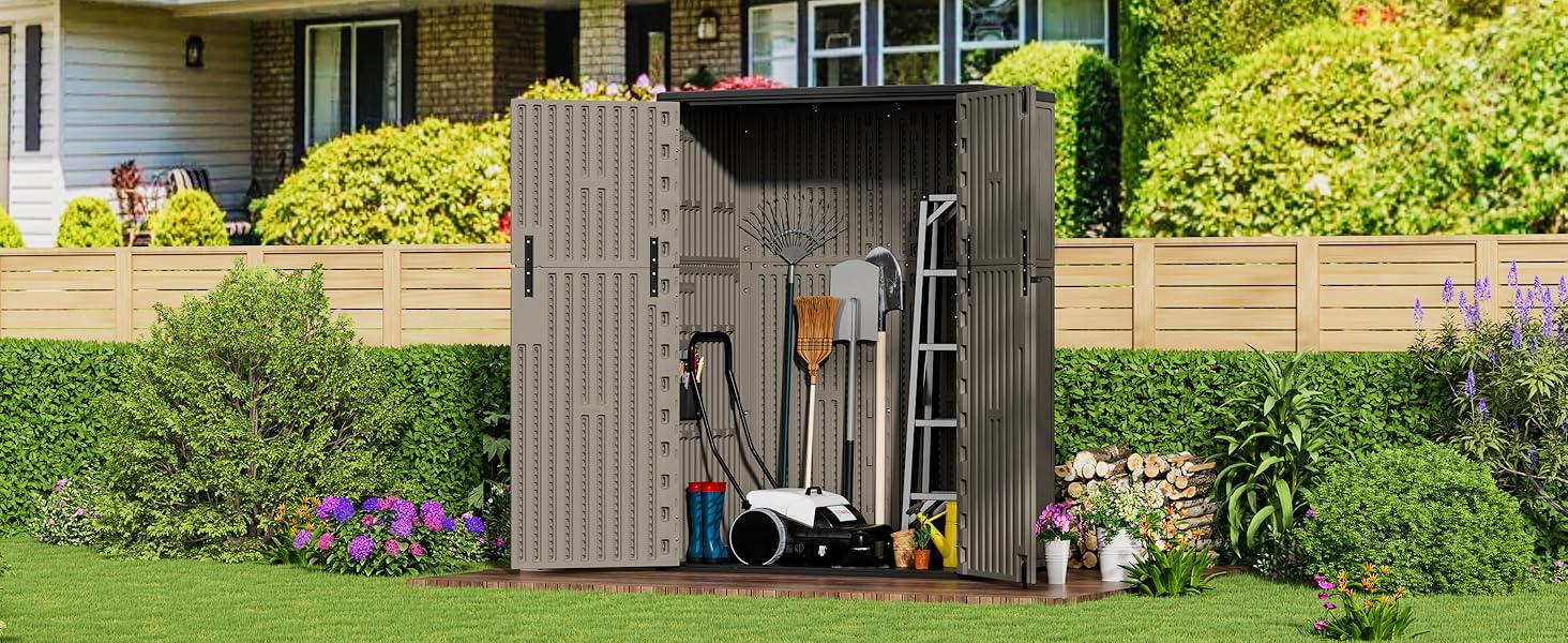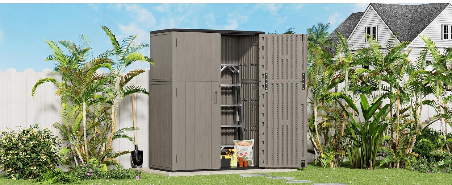 - [LARGE STORAGE CAPACITY] —External size: 51.6 in. W x 27.6 in. D x 69 in. H; interior size:49.2 in. W x 25 in. D x 67 in.H, outdoor shed capacity is 57 cu.ft,suitable for storing lawn mower,garden long tools,patio furniture and pool accessories.