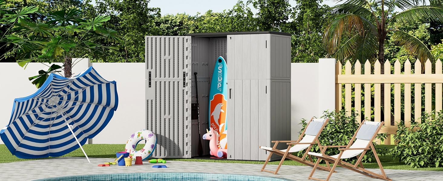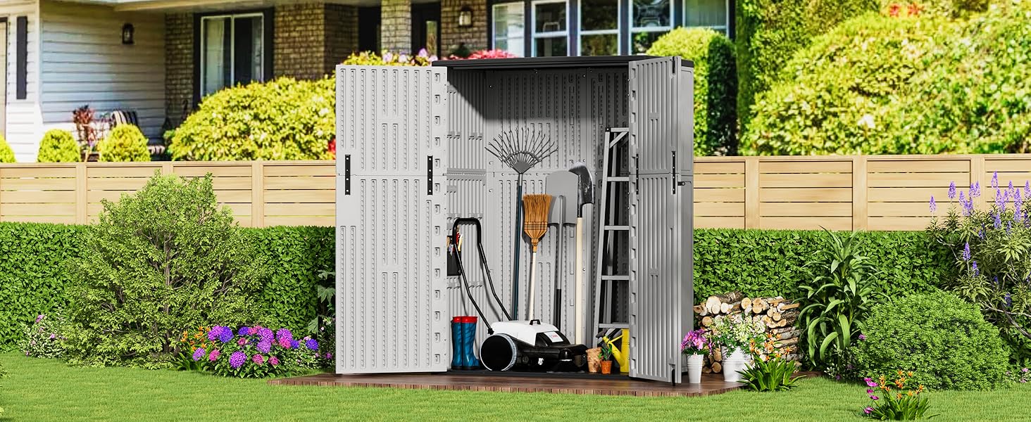 - [LARGE STORAGE CAPACITY] —External size: 51.6 in. W x 27.6 in. D x 69 in. H; interior size:49.2 in. W x 25 in. D x 67 in.H, outdoor shed capacity is 57 cu.ft,suitable for storing lawn mower,garden long tools,patio furniture and pool accessories.